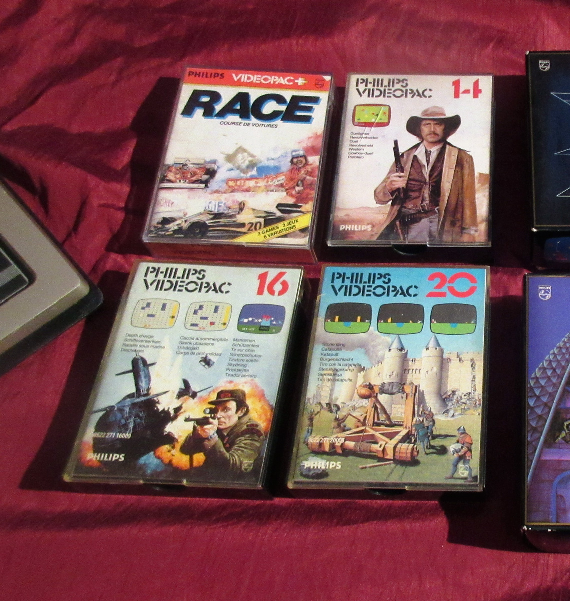 Kaivoin varastosta vaivalloisesti takkuuksien takaa varhaisen videopelikonsolin Philips Videopac G-7000. Vuosina 1978 – 1986 valmistetussa toisen sukupolven pelikonsolissa on edistyneesti näppäimistö ja pelikasettiportti vaihdettaville peleille. Kun taas vaikkapa varhaisissa Pong-kloonilaitteissa oli sama sisäänrakennettu tai joku variaatio samasta pelistä. Videopacissa kaksi ohjainta, RF-kuvajohto ja virtajohto ovat laitteessa kiinteästi kiinni. Olen ostanut tämän varmaan jostakin kirpparilta aikoinaan. Videopacin pelit poimin myös esille.