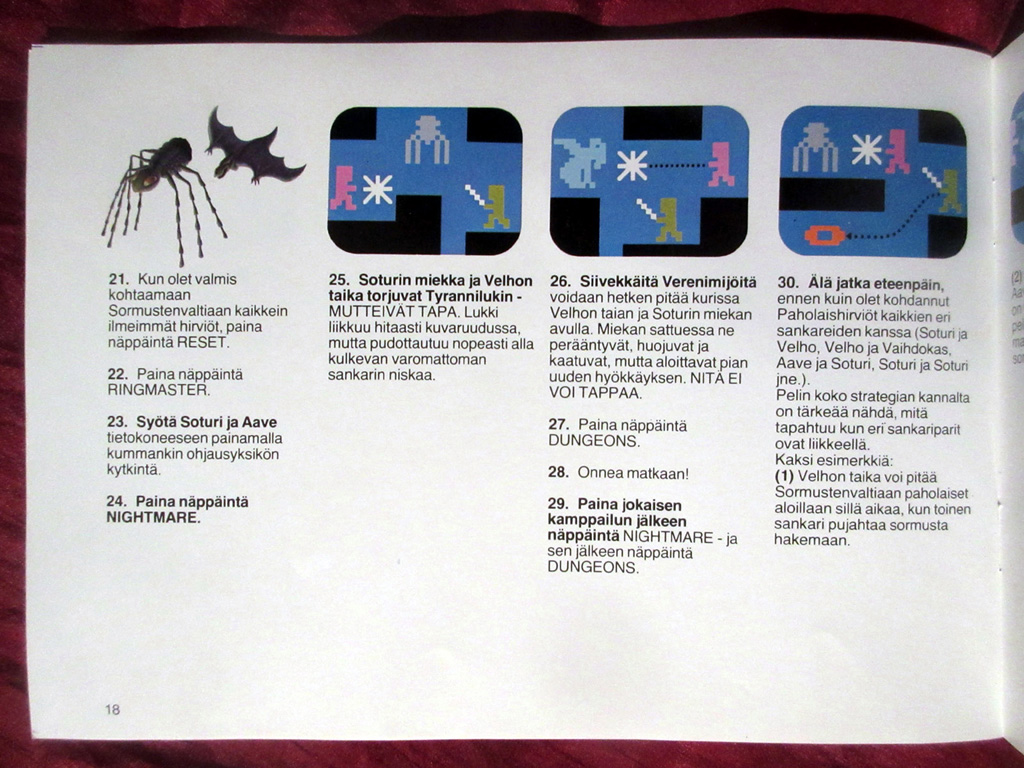 Aina on ollut kyllä mielessä, että joskus tätä erikoista lautavideopeliä pitää kokeilla. Koska alkuperäinen laitevanhukseni on tehnyt tenän vuosikymmenten jälkeen, asensin Videopac-emulaattorin niin pääsin kokeilemaan pelin videopelipuolta – taistelemaan lohikäärmeitä ja hirviöitä vastaan miekalla ja poimimaan sormuksia. Tarkkana saa hommassa olla, ettei osu laavaan. Ylhäältä tai alhaalta tulevaa hirviötä ei voi myöskään teloa, vaan ainoastaan sivusta.